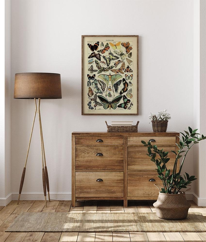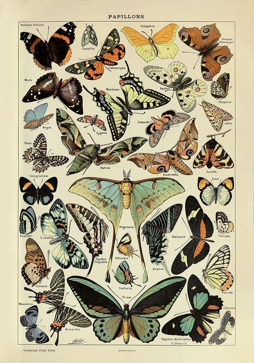 Millot var en fransk litograf och entomolog. Det första betyder att han var skicklig på en viss typ av grafiskt tryck, och det senare betyder att han var specialist på insekter. Den begåvade franske konstnären illustrerade många av sidorna i Le Petit Larousse Illustré, ett gammalt franskt uppslagsverk som behandlar naturhistoria. Och det är förståeligt att han fick uppgiften, eftersom hans illustrationer är otroligt vackra. Denna poster med fjärilar, Papillons Pour Tous, är ett nytryck av Millots ursprungliga uppslagsverksillustration från början av 1900-talet. Vi har lagt stor vikt vid att restaurera den så att du kan njuta av den hemma.