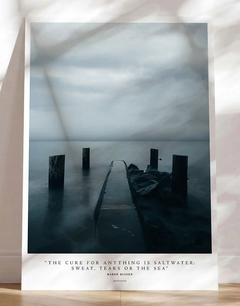Melankolisk men vacker fotoposter med en mörk stenbrygga och ett vackert citat av Karen Blixen.