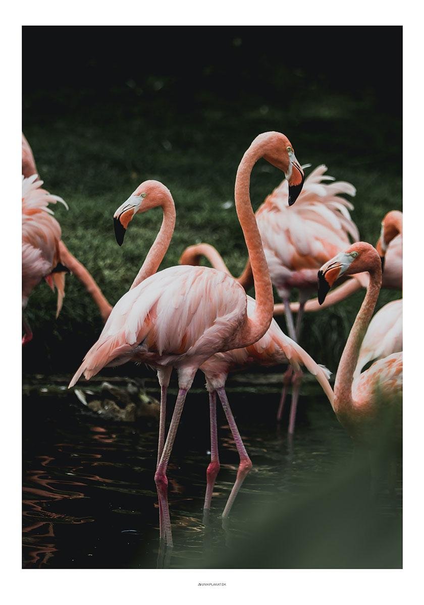 Affisch med rosa flamingoer som plaskar omkring. Färgerna på fotoaffischen är mörka och kompositionen är elegant. Kanske ett förslag till din nästa affisch till vardagsrummet?