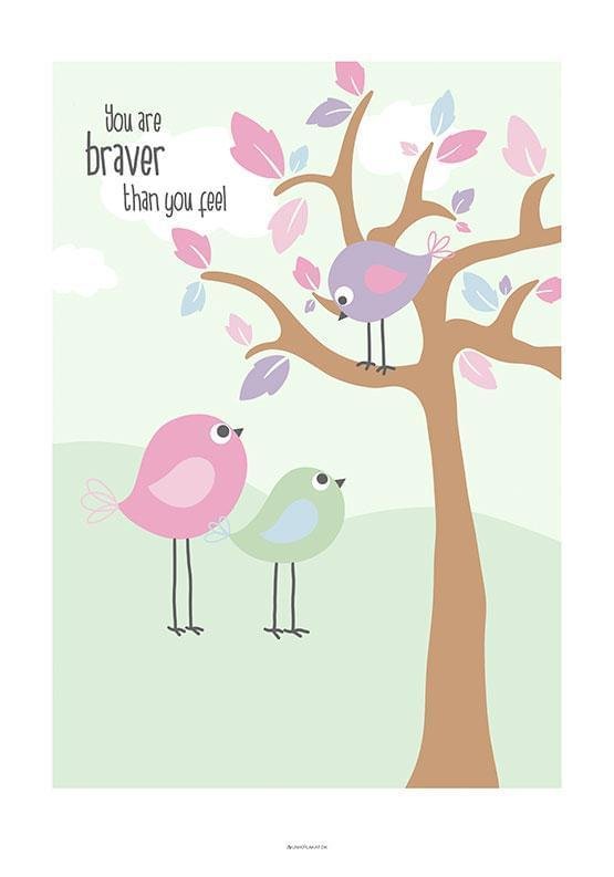 De två fåglarna på marken tittar på den lila fågeln som har klättrat hela vägen upp i trädet. Ja, fåglar kan flyga, men det är inte säkert att den lilla fågeln är medveten om det än – och därför förtjänar den beröm för sitt mod.