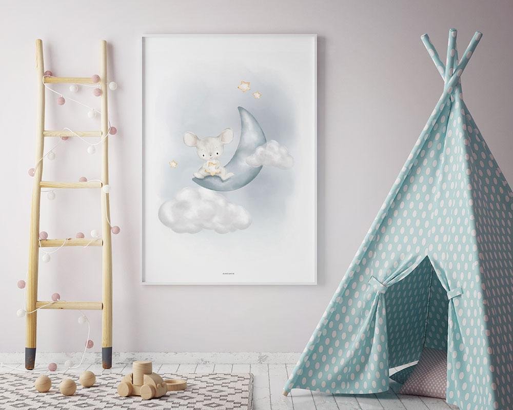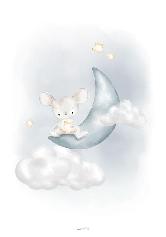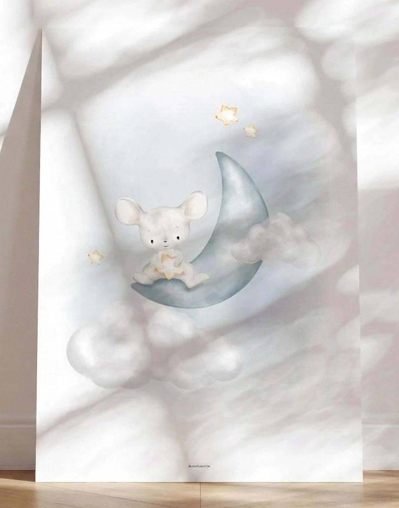 Den söta musen har hittat en stjärna och tittar fascinerat på den. Handritad illustration i akvarell och gouache för barnrummet.