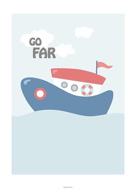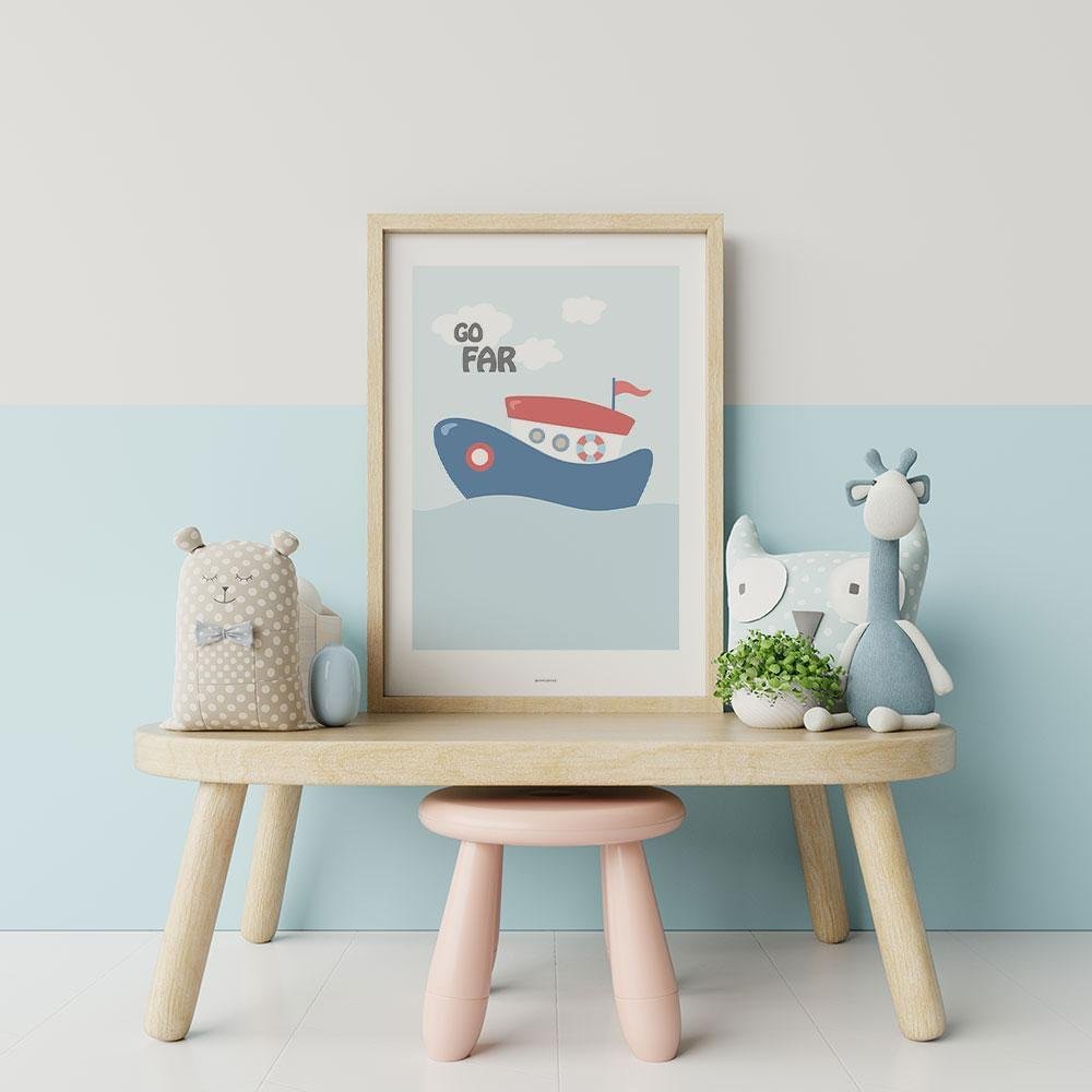 Barnposter i marint tema med en söt liten båt på den blå vågen.