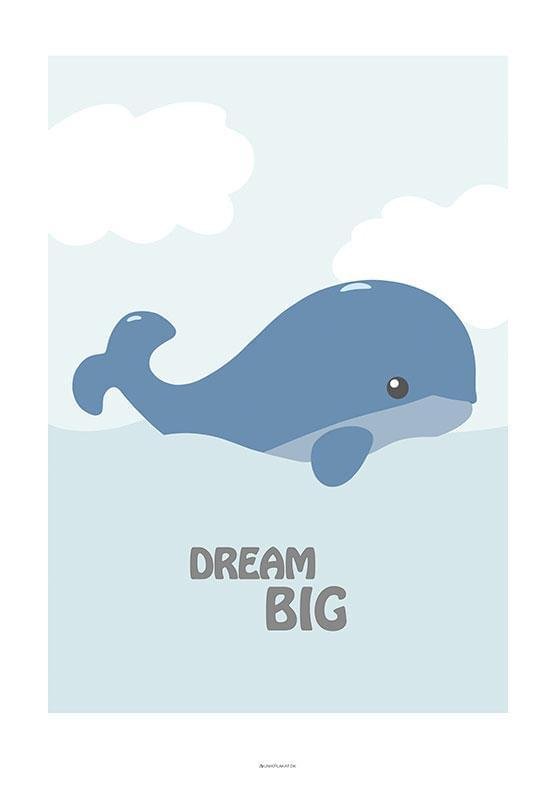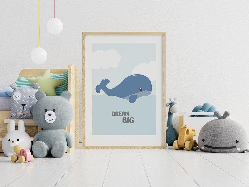 Barnposter med marint tema i lugna blå nyanser. Kom ihåg att uppmuntra de små att drömma drömmar stora som valar, så att drömmen – även efter en tur i tvättmaskinen – fortfarande är lika stor som ett hus ;-)