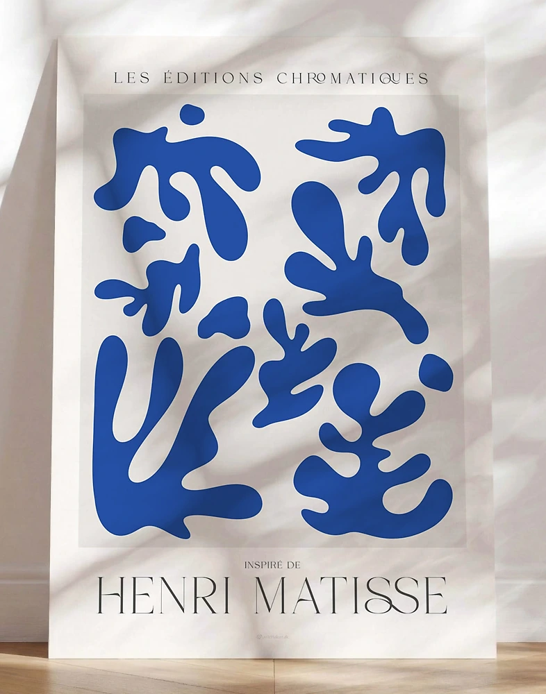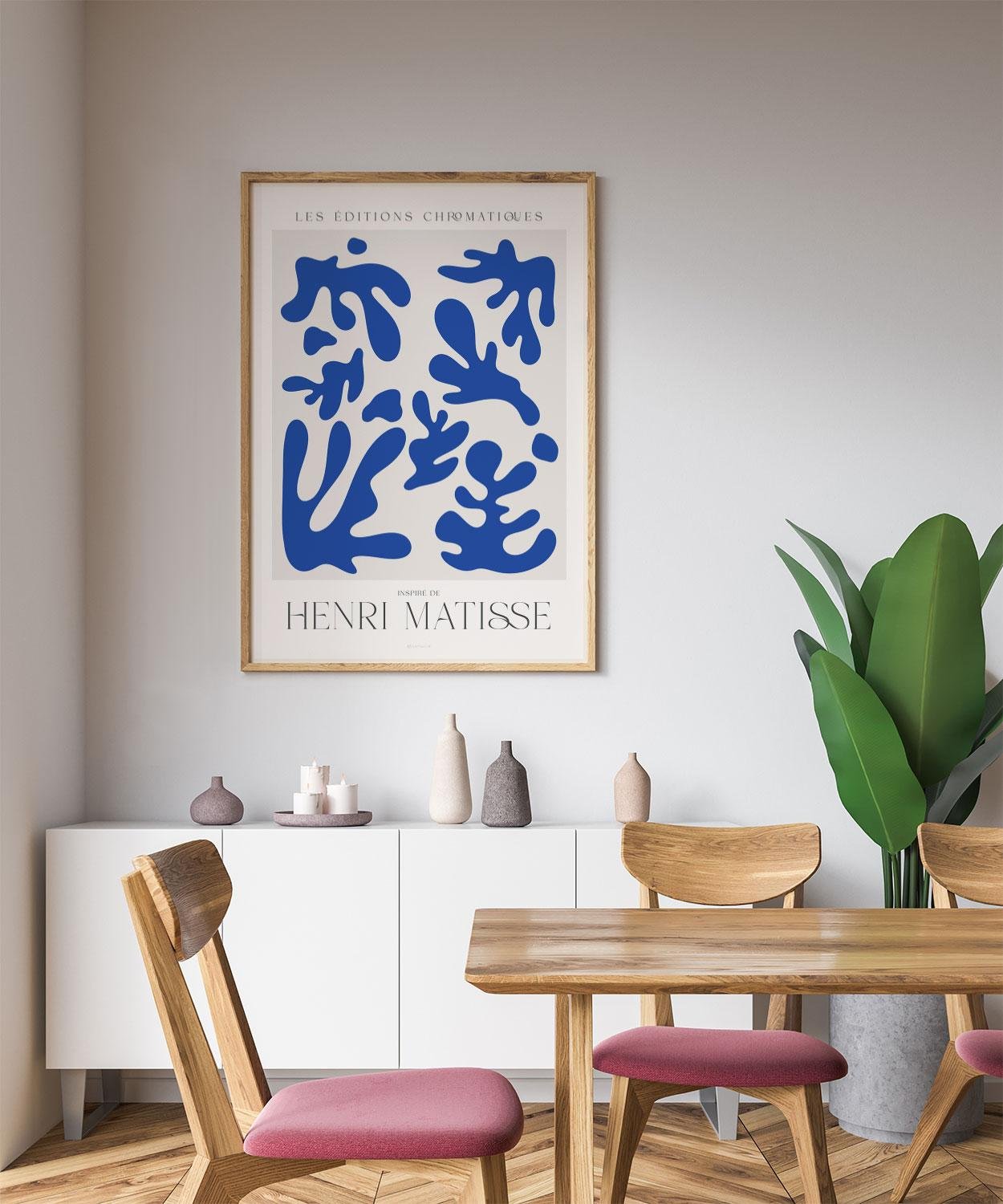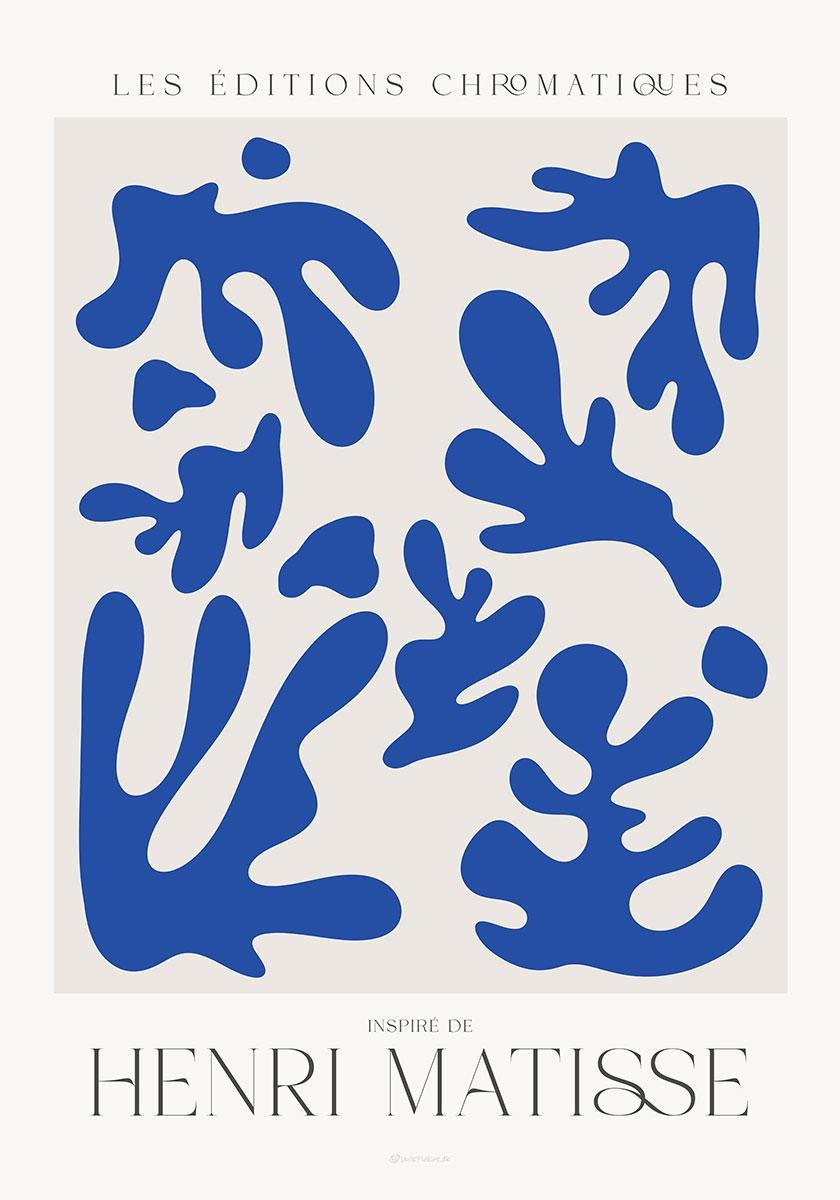 Blå Matisse-affisch inspirerad av Henri Matisses ikoniska pappersklip. Med sax som pensel skapade han former som dansade fritt över duken. Här utvecklas klara, djupblå nyanser till dynamiska, koralliknande former som tydligt sticker ut mot den ljusa sandfärgade bakgrunden. Den blå nyansen vibrerar av energi och rytm och hyllar en total avsaknad av rädsla för att använda djärva färger.