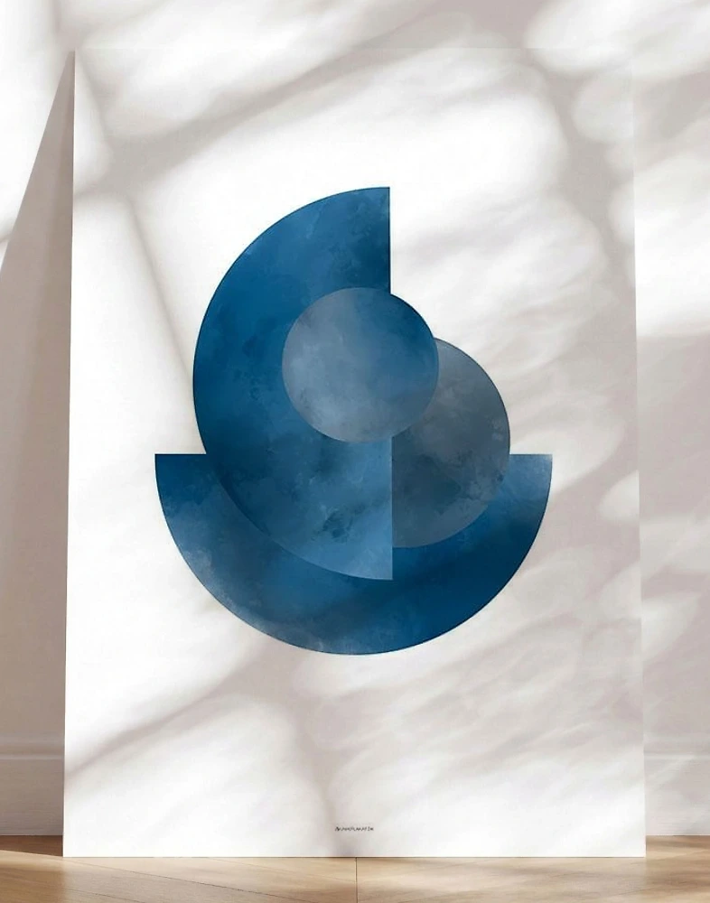 Vackra blå nyanser och geometriska former samsas på denna grafiska affisch.