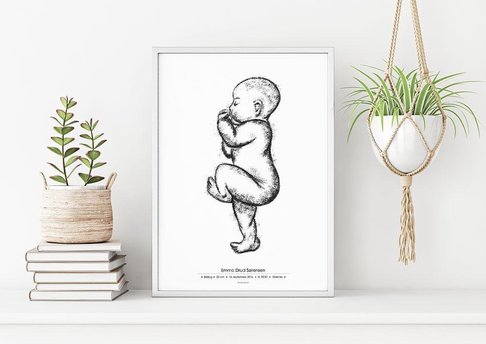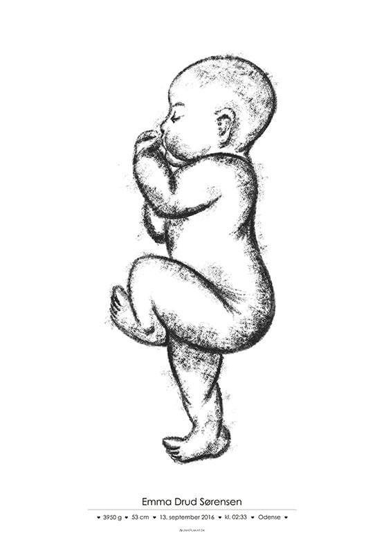 Modell nr 4 av våra fina födelseposters i skala 1:1. Denna modell finns med två skisser - en blyertsskiss och en kolskiss. Den här lilla bebisen ligger med ena benet utsträckt, vilket är anledningen till att vi kan göra en födelseposter med ditt barns exakta längd när du beställer en poster i storleken 50x70 cm. Du kan säkert beställa postern i en mindre storlek, men här har vi inte plats för det naturliga skalförhållandet.