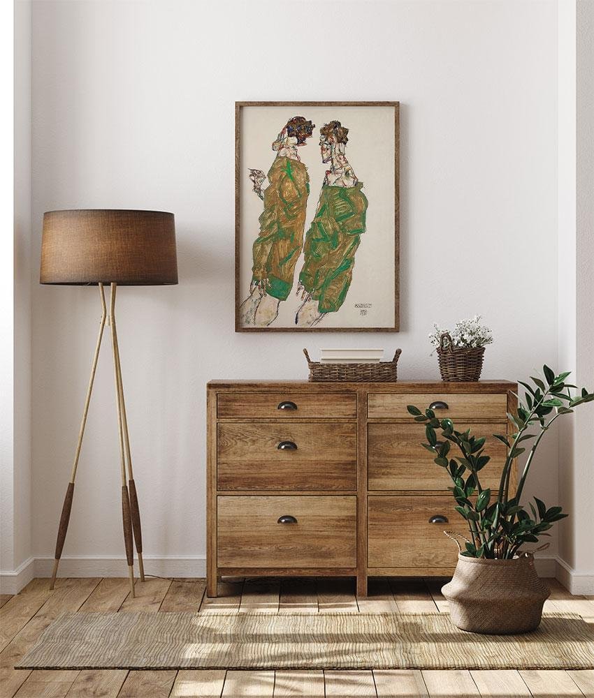 Målningen, som är från 1912, visar Schieles unika stil, som kännetecknas av förvrängda och uttrycksfulla former. I Devotion är de vackra gröna figurerna sammanflätade, deras kroppar smälter samman för att förmedla en känsla av intensiv samhörighet och emotionell intimitet. Schieles användning av djärva linjer och kantiga former bidrar till den övergripande känslan av passion och hängivenhet i konstverket. Målningen speglar Schieles utforskande av mänskliga relationer och djupet i känslomässiga band, teman som återkommer i hans verk.