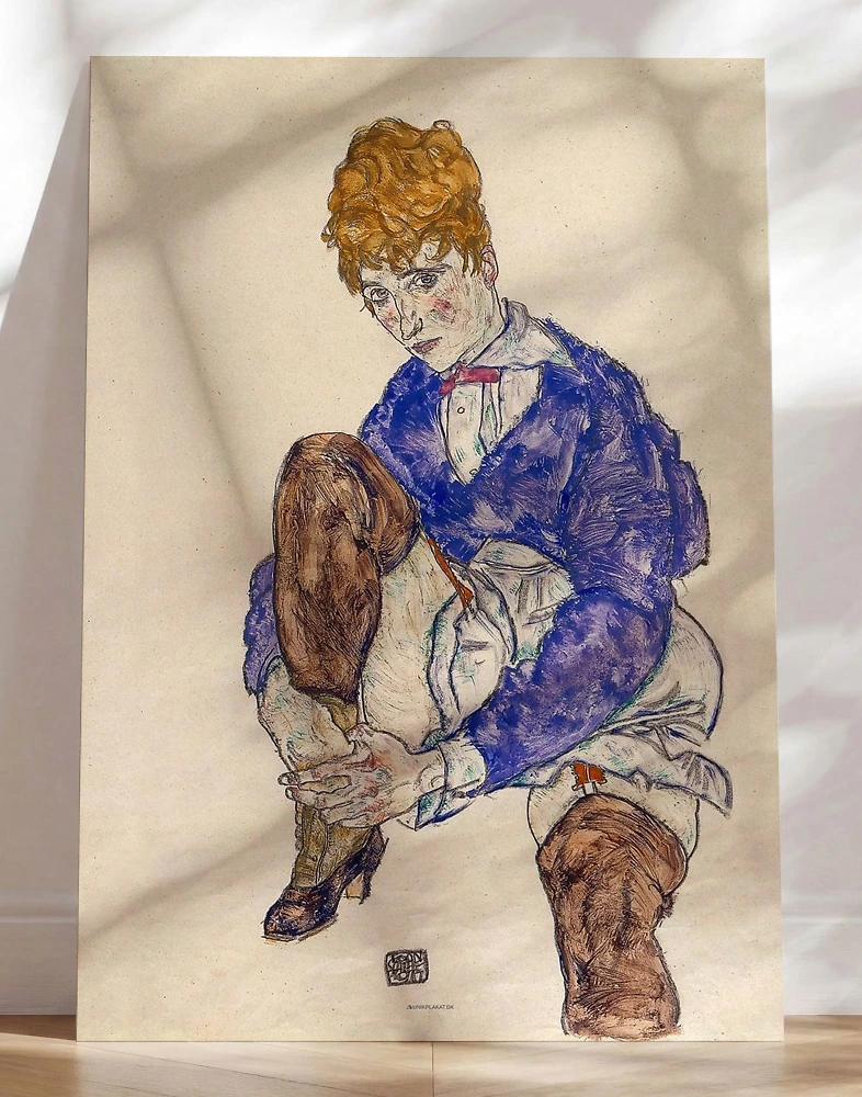 Egon Schieles Porträtt av konstnärens hustru är en intim målning som föreställer en kvinna klädd i blått som håller om sitt knä. Målningen är skapad av den österrikiske konstnären Egon Schiele och visar hans karakteristiska stil med förvrängda former och starka linjer. Den kvinnliga figuren framställs med en blandning av sårbarhet och styrka, medan hennes omfamning av knäet och hennes position utstrålar en känsla av eftertänksamhet. Färgskalan förstärker målningens emotionella djup.