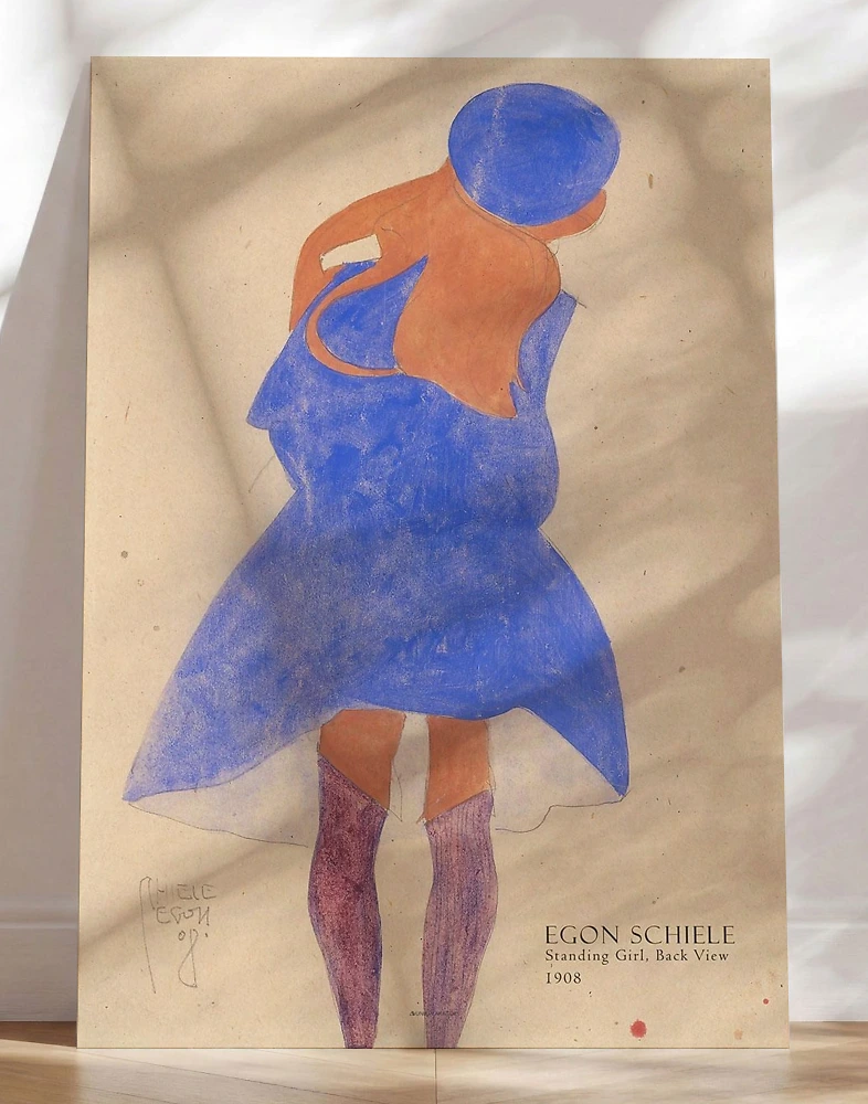 En annan vacker affisch av Egon Schiele med härlig, klarblå färg som dominerande färg. Flickan med ryggen vänd mot betraktaren är från 1908.