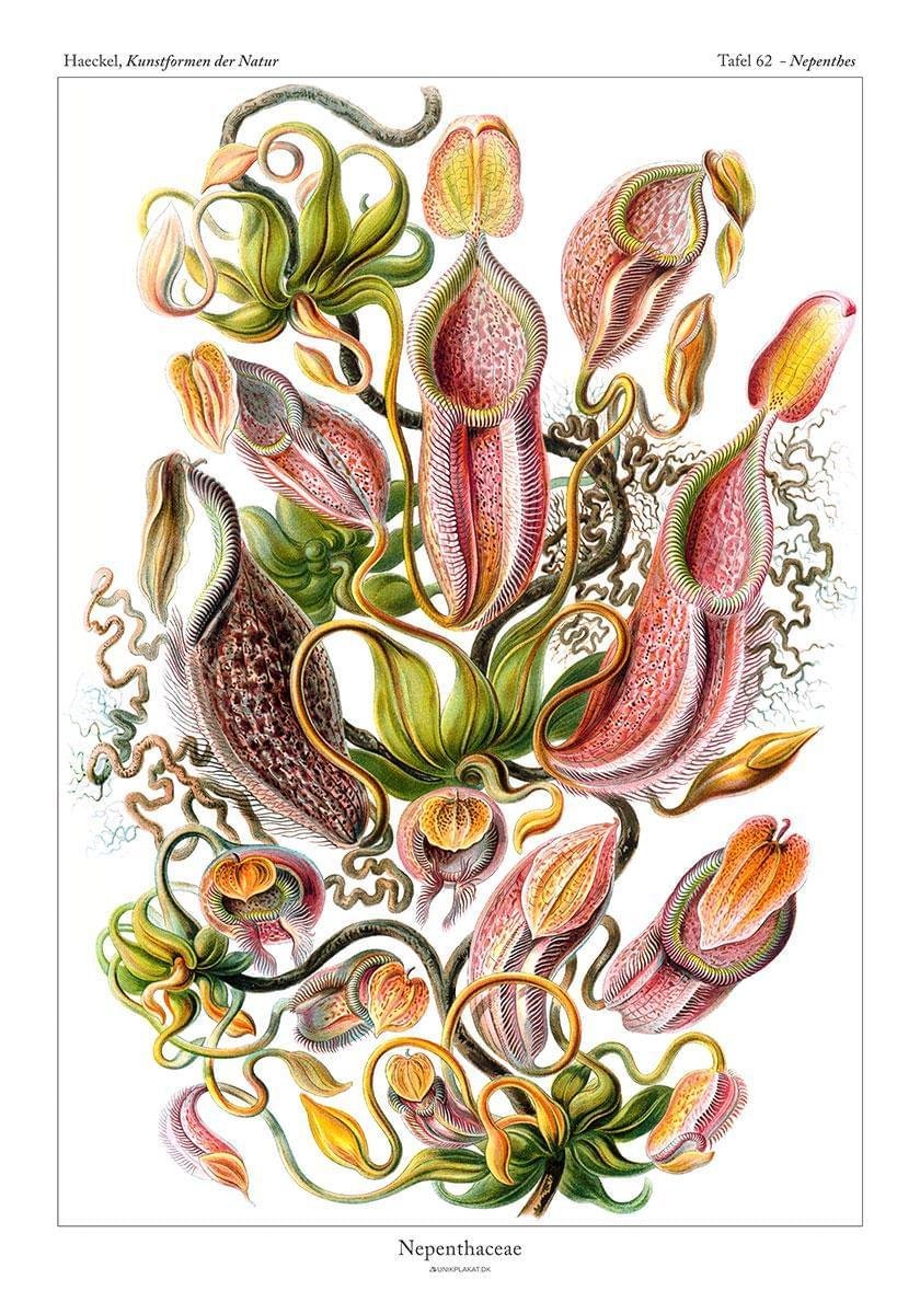Ernst Haeckels illustration av Nepenthaceae har vackra färger som lockar, och det är också meningen. Nepenthes, som betyder kannranka på svenska, omfattar en familj av köttätande växter. Kanna är epifyter, vilket innebär att de växer på andra träd istället för i marken. De finns i regnskogen, och om du inte är ett insekt bör det vara ganska säkert att titta närmare på denna färgglada växt.