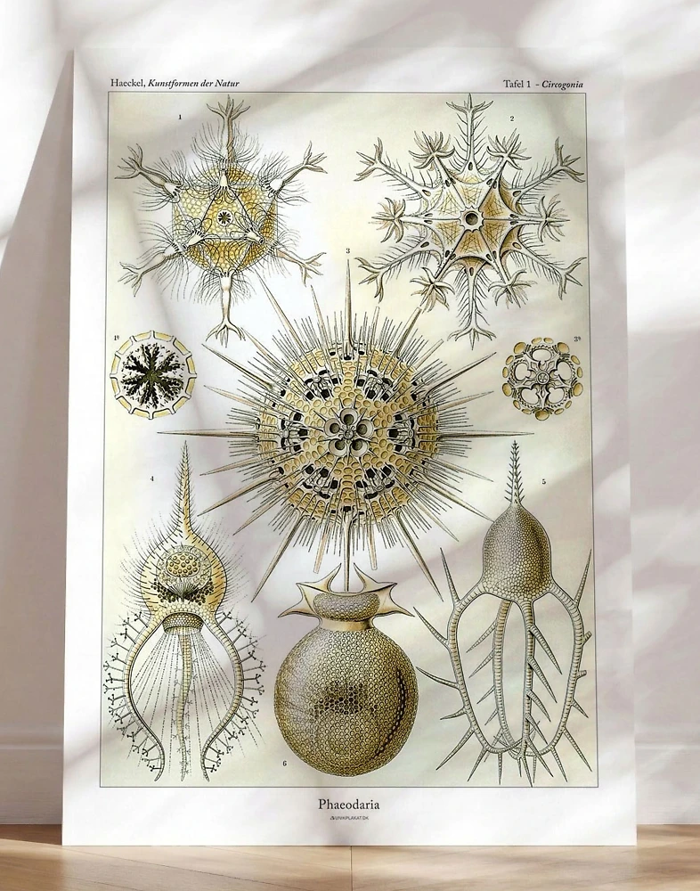 Ännu en uppslagsverksaffisch med illustrationer från Ernst Haeckels Kunstformen der Natur. Denna retroaffisch avbildar vattenlevande organismer, vilket måste ha fascinerat Haeckel med sin symmetri. Mönstren och symmetrin var något som Haeckel lade ner mycket tid och energi på att betona i sina många illustrationer.