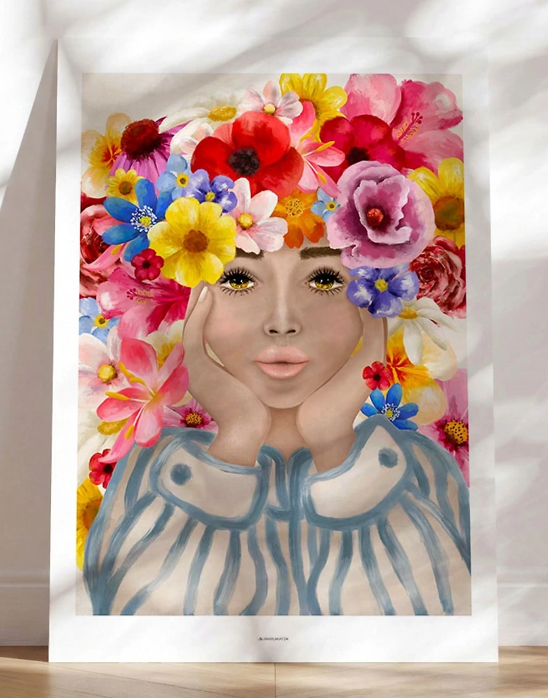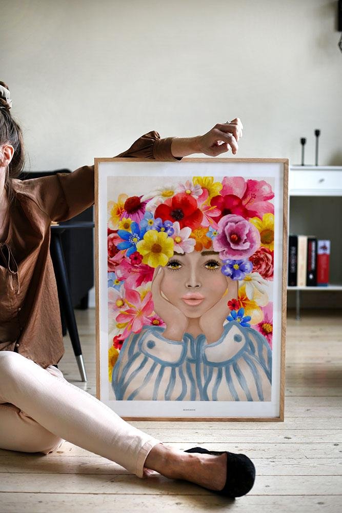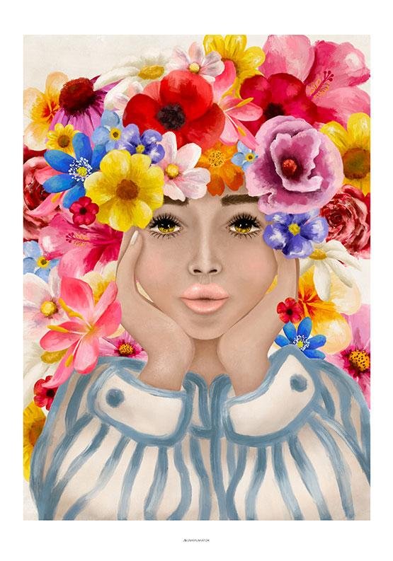 Konstaffisch med en blomsterflicka. Ljusa färger och intensiv blick.