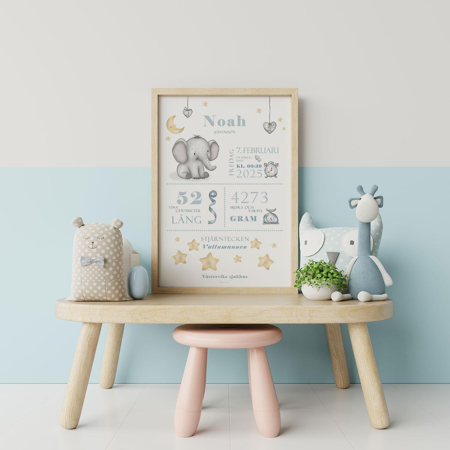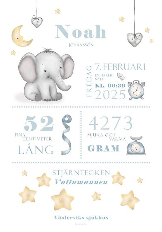 Födelseposter med elefant – babyblå till pojke