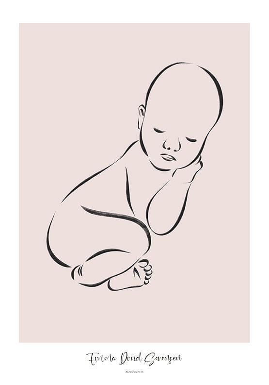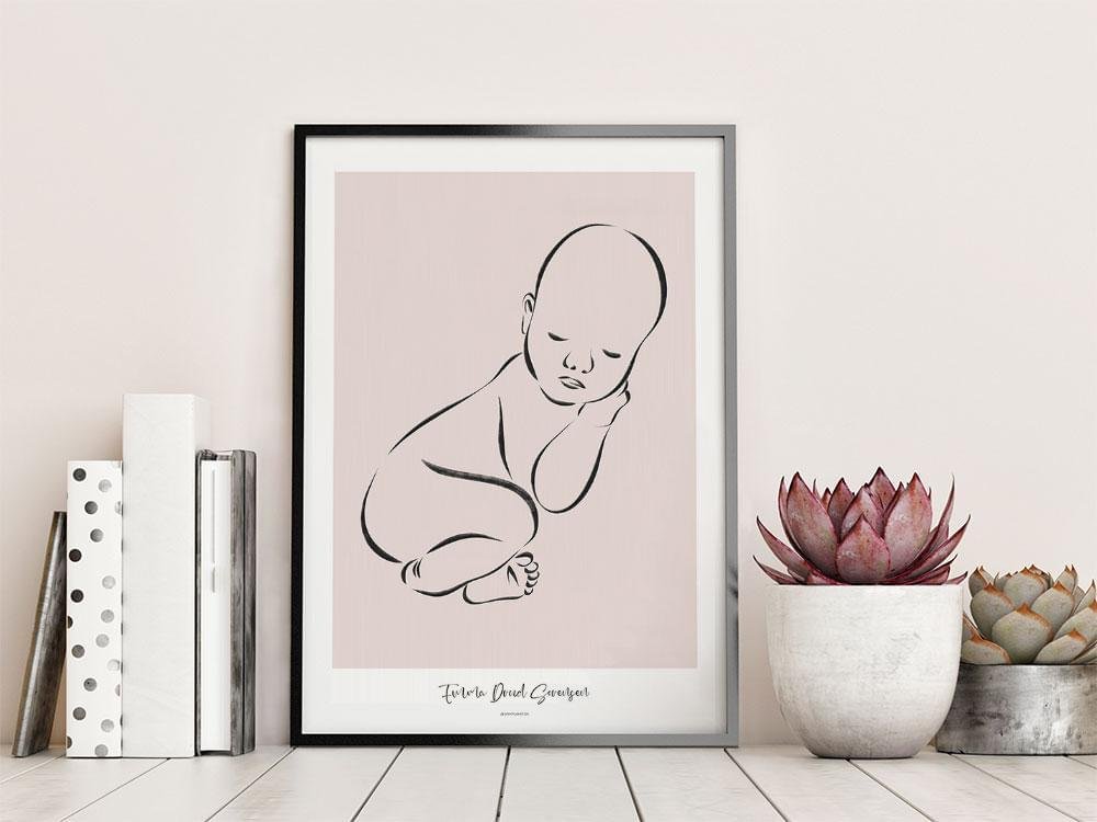 Födelseposter i skala 1:1 med en skiss av en liten bebis hopkurad i fosterställning, liggande på mage. När du beställer födelsepostern i B2 (50x70 cm) gör vi den så noggrant som möjligt i skala 1:1. Det kommer att finnas en liten osäkerhet, eftersom bebisen i denna skissa inte ligger utsträckt.