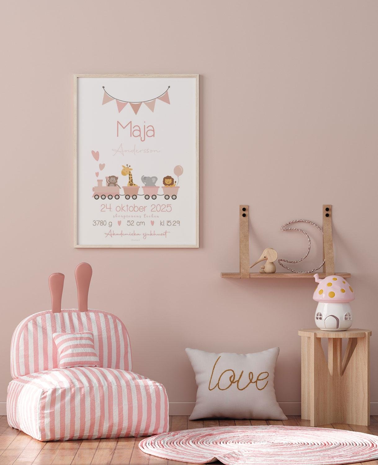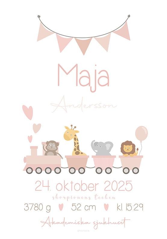 Söt födelsetavla med ett rosa tåg som rullar in lagom till dop eller namngivningsceremoni, fyllt med paket och kärlek. En personlig och uppskattad present till både föräldrar och baby – perfekt som minne från barnets allra första tid.