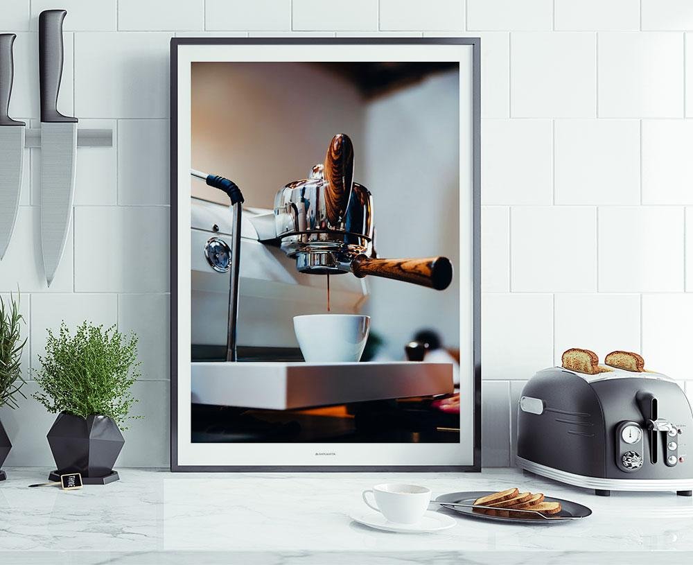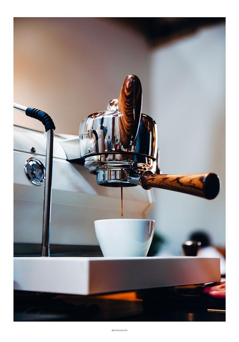 Fin fotoposter som visar espressomaskinen i full gång när den tillagar morgonens espresso. Man kan nästan känna doften av de nymalda bönorna.