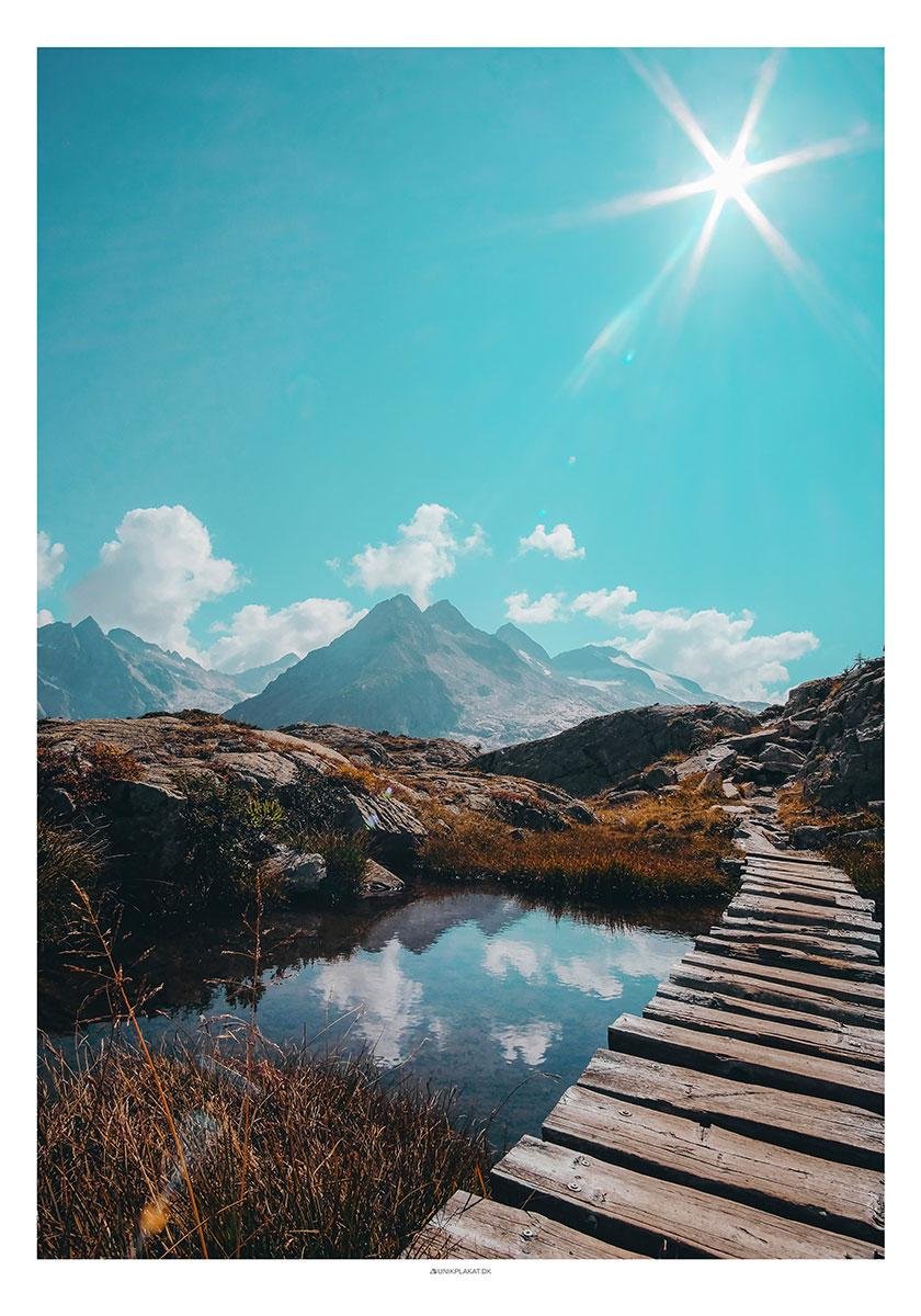 Vacker landskapsaffisch med högt stående sol och utrymme för reflektion.