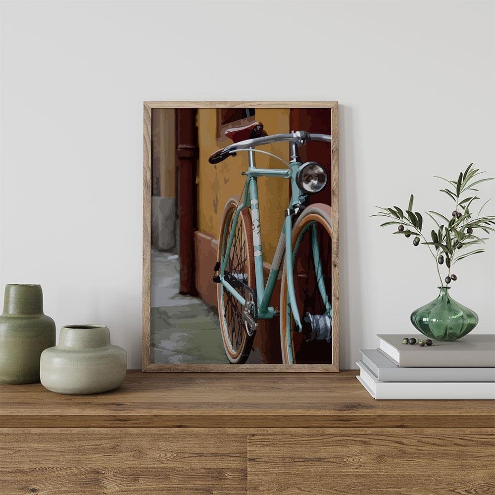 Grafisk poster med en vacker turkos retrocykel.