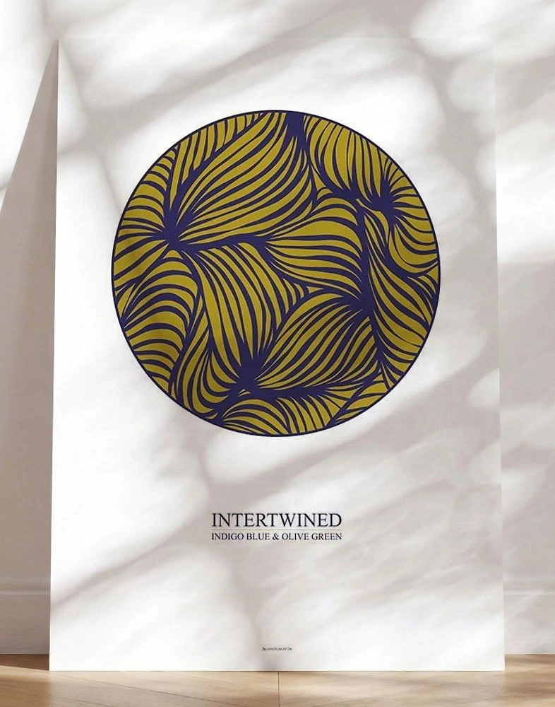 Vackert indigoblått mönster i pappersutskuren look mot en lugn olivgrön bakgrund.