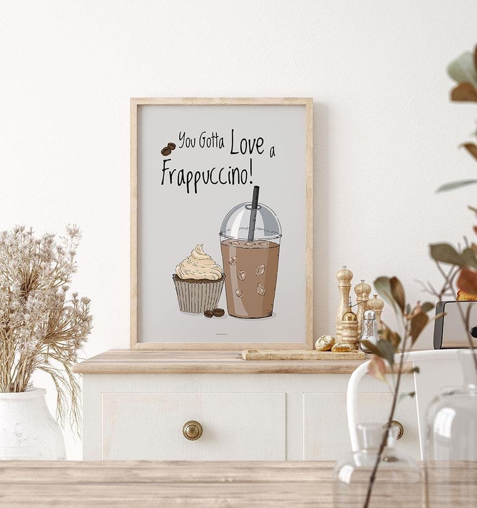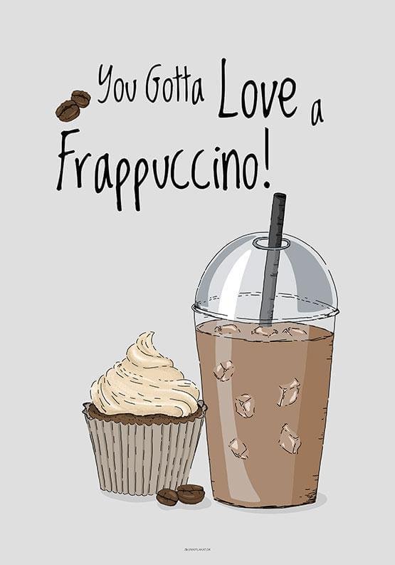 Den svala Frappuccino – eller Frappé mixed friends – är en kall kaffevariant med kaffe, mjölk och svalkande isbitar. När sommarvärmen lägger sig i hemmakontoret finns det inga gränser för hur många av dessa läckra, sandfärgade halløjsær som kan förvaras i mitt kylskåp. Om Frappé ska sprida en god stämning i ditt kök, här är en handritad kaffeposter perfekt för ändamålet :-)