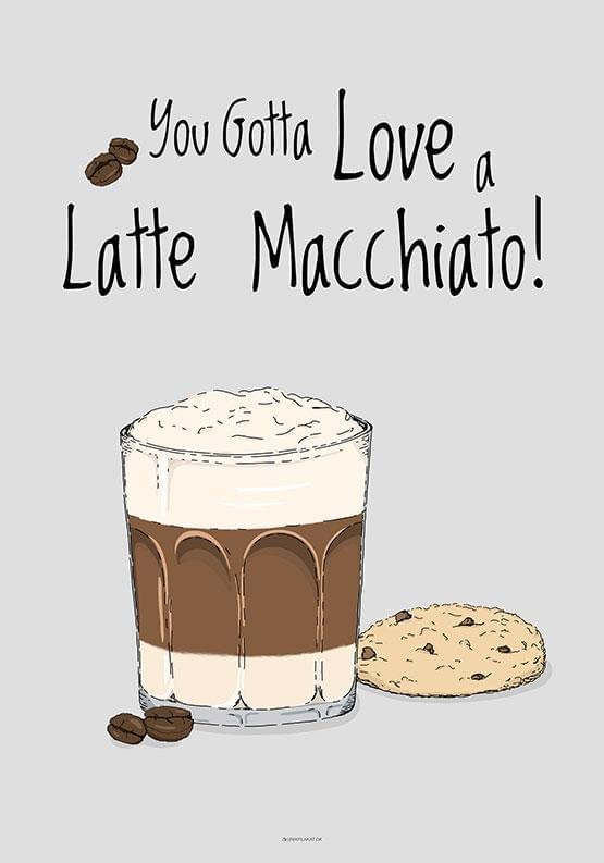 Macchiato är en härlig trefärgad kusin från kafferiket. Macchiato betyder fläckig, så det namnet passar perfekt till det vackra regnbågskaffet. Fläcken syftar på espresson som med lite fingerfärdighet bildar ett lager mellan den varma mjölken i botten och skummet i toppen. Handritad kaffeposter för dig som älskar en god kopp kaffekonst!