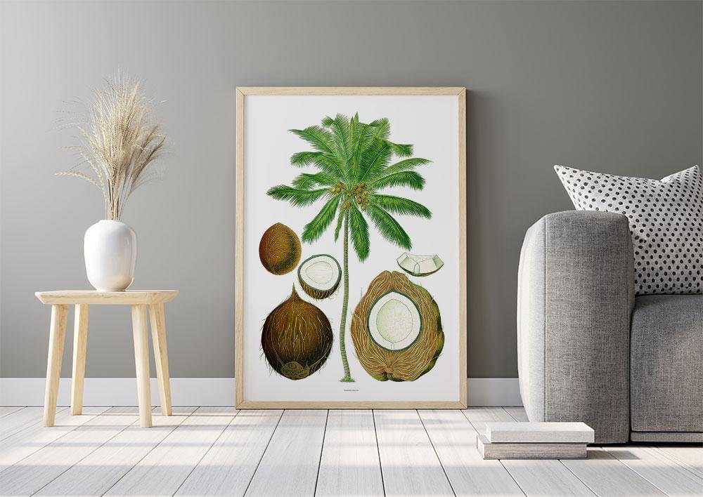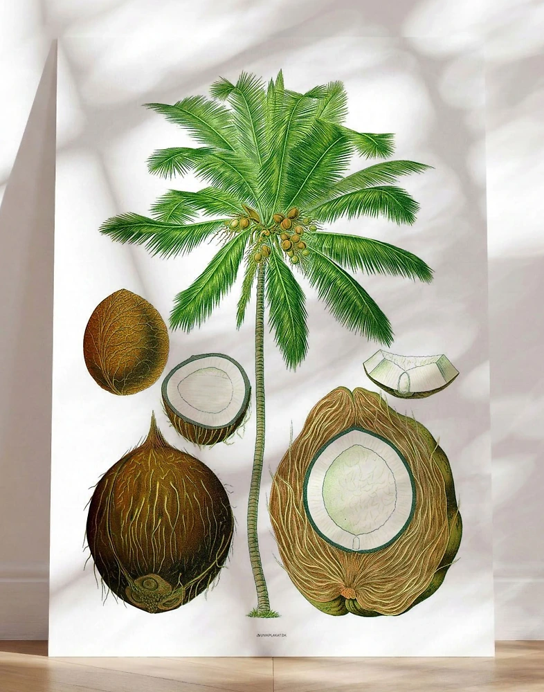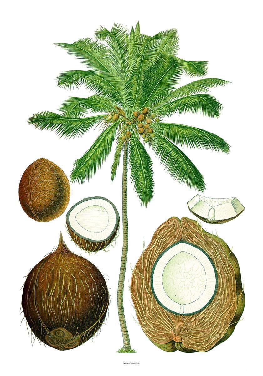 En stämningsfull gammal illustration av kokospalmen och kokosnöten. Den fina teckningen kommer ursprungligen från Herman Adolph Köhlers uppslagsverk om naturmedicin från slutet av 1800-talet.