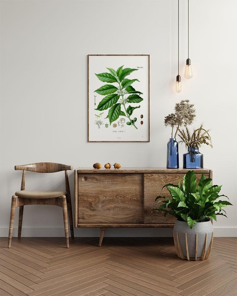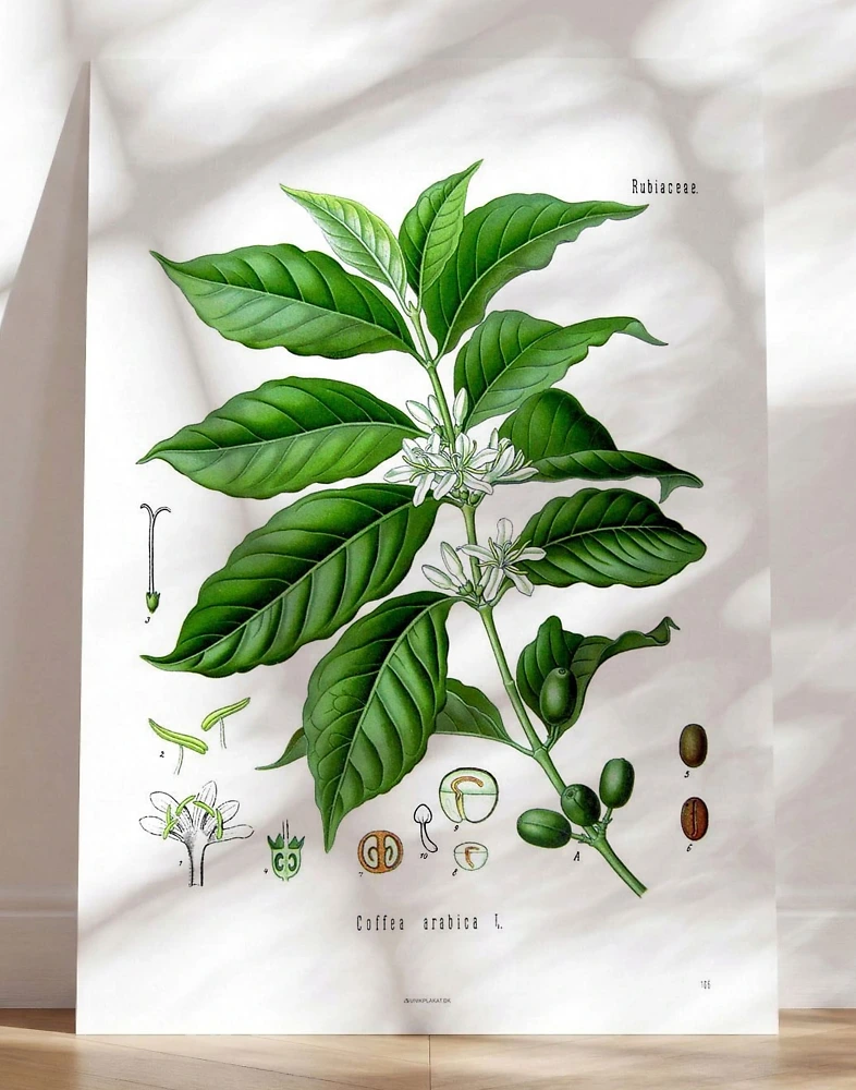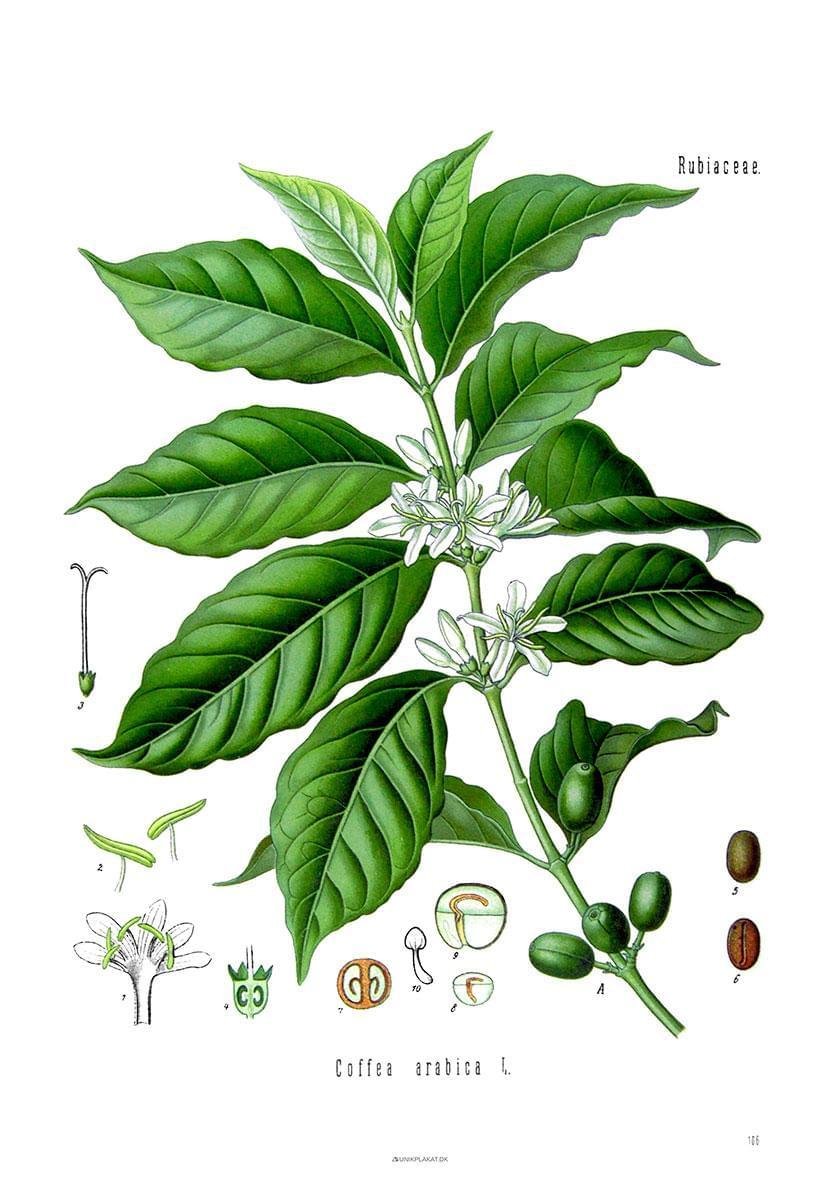 Vacker kaffeposter med gammal illustration av Herman Adolph Köhler. Köhler var en tysk kemist och läkare med stort intresse för naturmedicin. I slutet av 1800-talet publicerade han flera verk om växter och deras hälsoegenskaper, och det är från dessa uppslagsverk som kaffeplantan här har sitt ursprung.