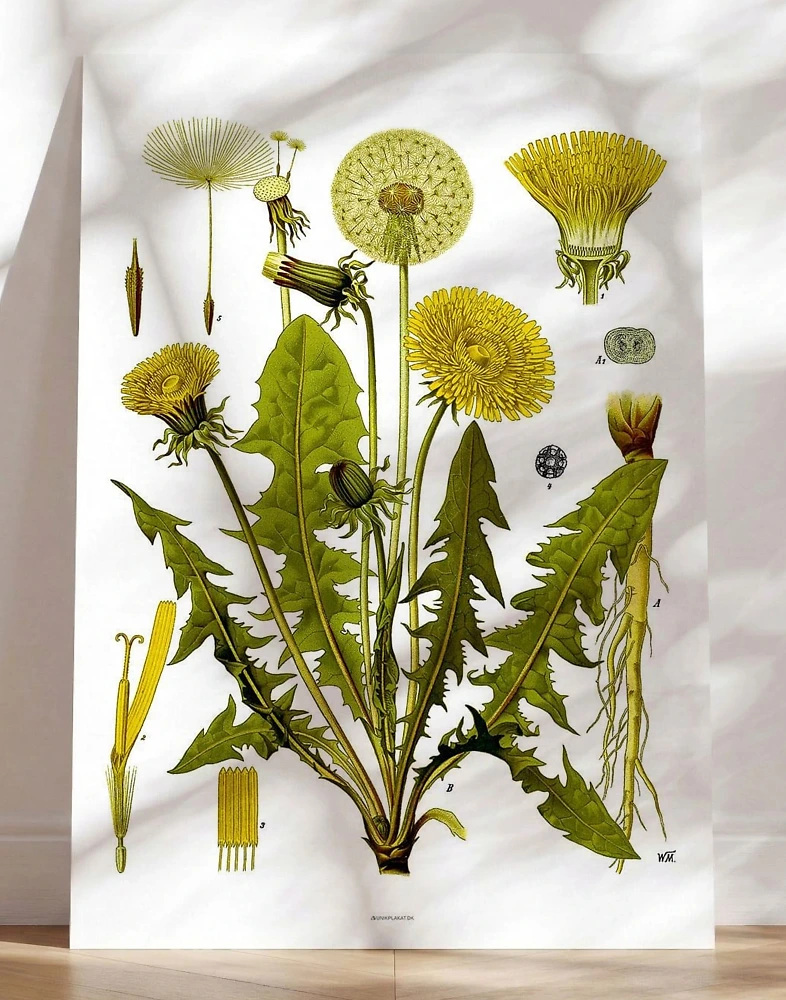 Den vackra maskrosen är en gammal illustration från den tyske läkaren och kemisten Hermann Adolph Köhlers böcker om naturmedicin. Affischen är ett nytryck, och vi har valt att behålla små fel från originalpapperet eftersom det skapar atmosfär och autenticitet.