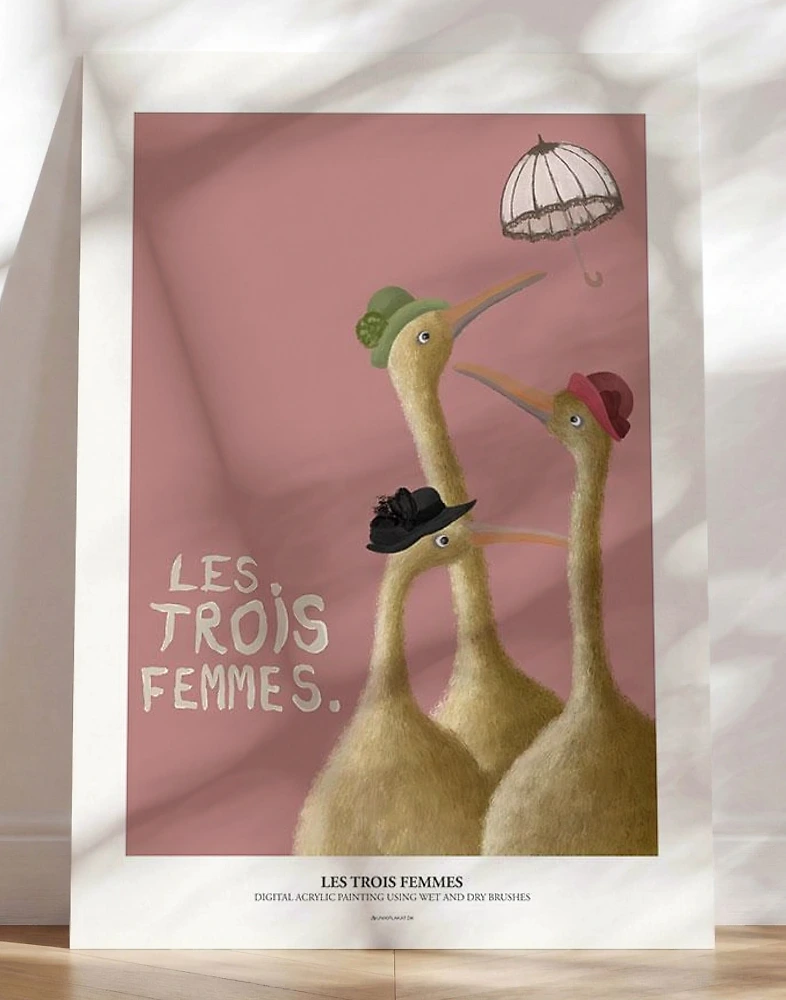 Postern här är en akrylmålning av tre bedårande fåglar på en promenad. Men både färgen och penslarna är digitala, och bakgrunden är en virtuell duk. En stor del av de affischerna som skapas runt omkring idag är gjorda med digital utrustning. Detta syns bland annat i de skarpa kanterna, de slingrande formerna och typsnitten som är upp och ner. Men visste du att den digitala pennan har blivit så bra att den också kan fungera som en pensel? Det kan den, och fåglarna här är ett exempel.