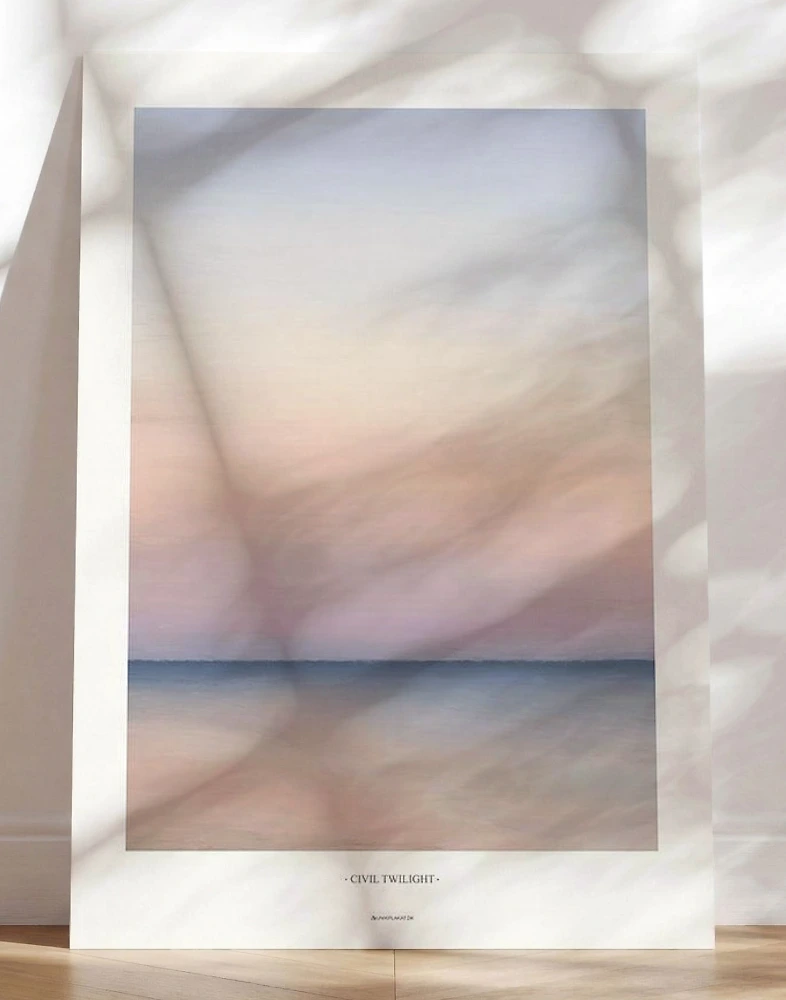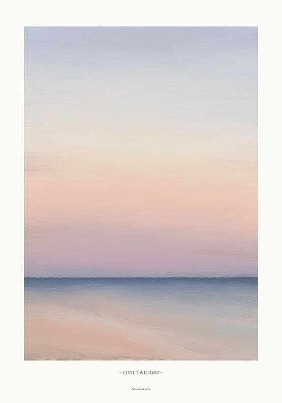 Konstposter som föreställer vad som händer strax efter solnedgången. De ögonblick då solen står 6 grader under horisonten och det fortfarande finns tillräckligt med ljus kvar för att njuta av lite utomhuskul kallas "civil twilight". Det är en av de där stunderna då himlen visar sin mest färgglada sida, och man bara måste stå still och njuta.