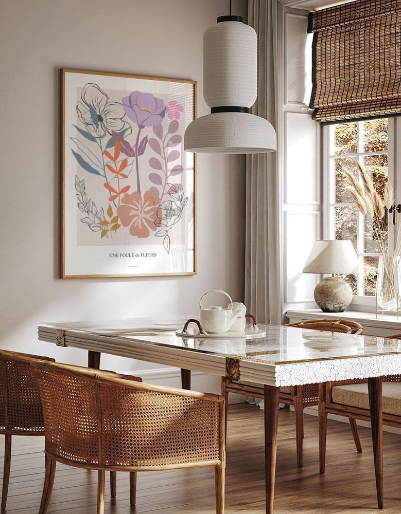 Blommiga posters är alltid en bra idé och passar i de flesta vardagsrum, kök eller sovrum. Den grafiska stilen ger en minimalistisk look som du kommer att gilla om du föredrar en ren look.