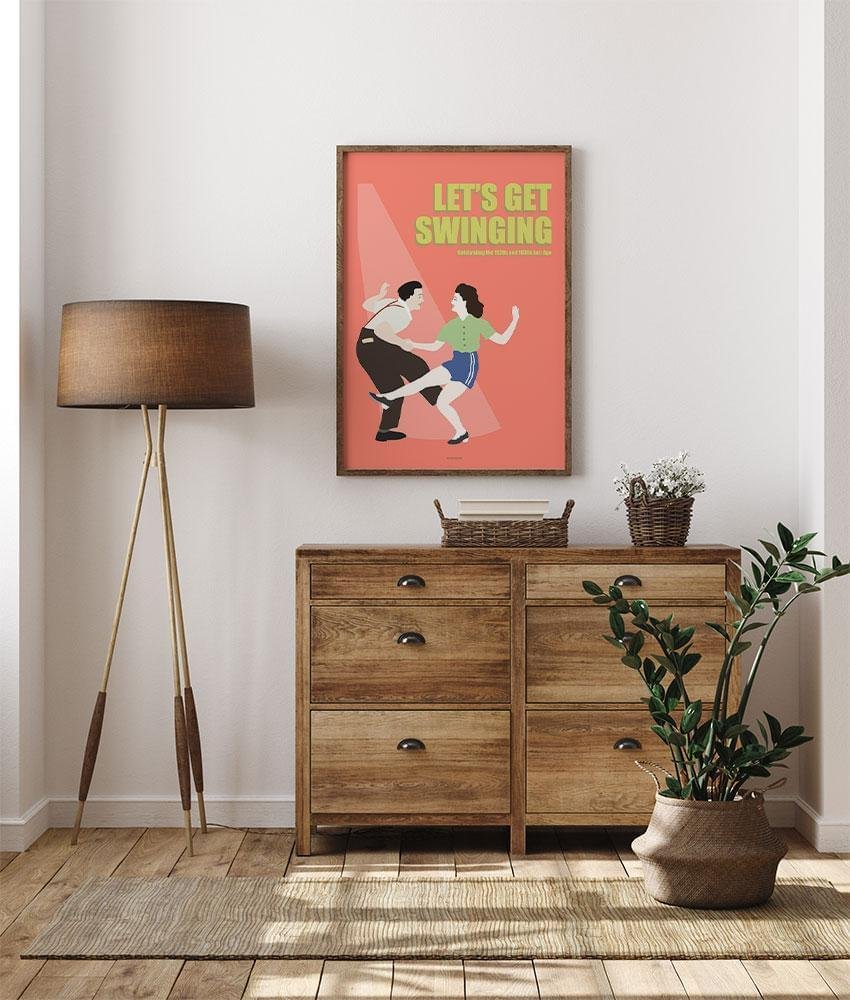 Färgglada posters livar upp ett rum och får dig på gott humör. Den här postern är en grafisk tolkning av Judy Garland, som ivrigt kastar sig in i en glädjefylld swingdans någon gång på 40-talet.