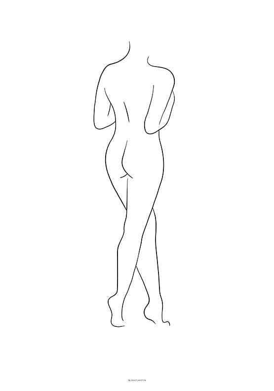 Linjekonstposter med en kvinnokropp sedd bakifrån. Den minimalistiska postern med en linjeteckning ger stil till vardagsrummet eller sovrummet, oavsett om den hängs ensam eller som en del av ett par.