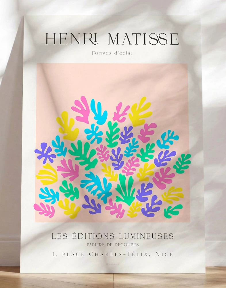 För Matisse var korallformen inte en explicit representation av naturen, utan snarare ett sätt att utforska relationen mellan form, färg och yta. Denna affisch visar tydligt hur repetition och variation kan skapa liv och energi, även i en abstrakt och stiliserad form. Formes de corail är därför både en hyllning till Matisses unika bildspråk och en utforskning av hur relativt enkla, organiska former tillsammans kan bli något man vill titta på länge.
