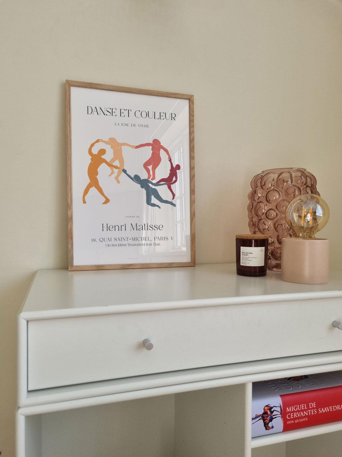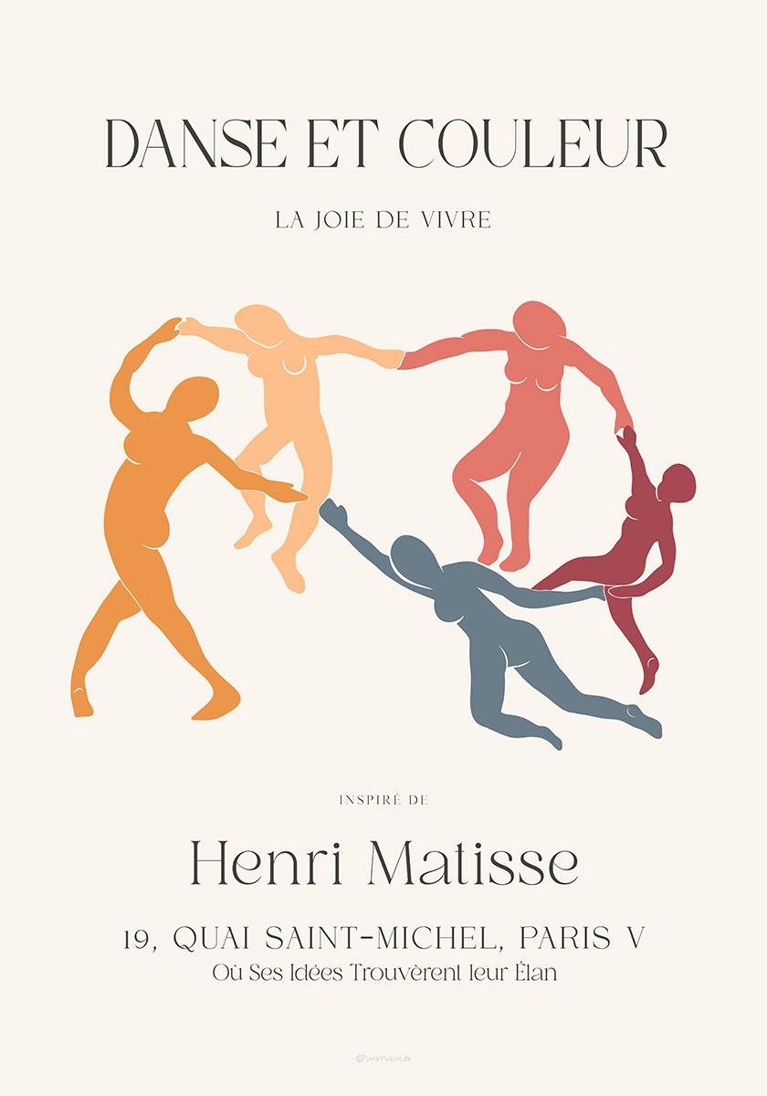 Matisse målade det ikoniska verket La Danse 1909–10. Målningen beställdes av den ryska samlaren Sergei Shchukin, som ville ha stora dekorativa verk till sin herrgård i Moskva. Den ursprungliga målningen föreställer fem nakna figurer som håller varandra i händerna och dansar i en cirkel på grön mark mot en intensiv, flammande röd himmel. Rörelsen är både enkel och hypnotisk: kropparna är utsträckta, vissa lätta, andra tunga, och kedjan av händer skapar en böljande rytm som fyller hela duken.