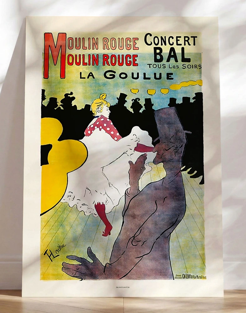 Henri de Toulouse-Lautrecs reklamaffisch för Moulin Rouge från 1891 är ett av hans mest kända verk och ett ikoniskt exempel på affischer från fin de siècle, vilket betyder slutet av 1800-talet i Paris. Affischen skapades för att marknadsföra den berömda kabaréen Moulin Rouge och visar en scen från dess livliga dansföreställningar. Affischen visar ett par som utför en energisk cancan-dans. Den kvinnliga dansaren och stjärnan på Moulin Rouge, La Goulue, hette egentligen Louise Weber, och hon framställs i en dramatisk, förvrängd position som fångar hennes livliga rörelser och sensualitet. Toulouse-Lautrec fångar scenens dynamik med sina karakteristiska kraftfulla linjer och användning av starka, kontrasterande färger.