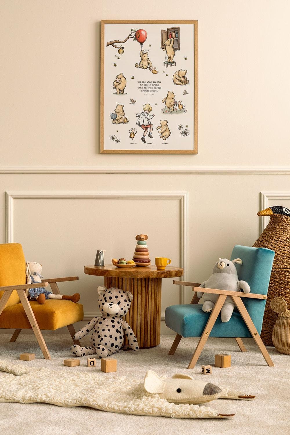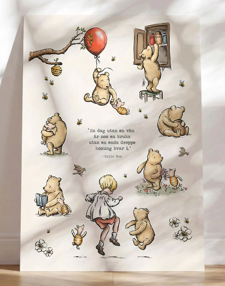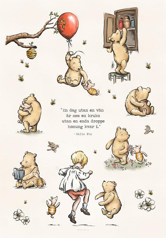Fin Nalle Puh-poster med en samling av Ernest Howard Shepards klassiska illustrationer från berättelserna om Nalle Puh och hans vänner. En nostalgisk och dekorativ barnposter som passar perfekt i barnrummet och skapar en varm och trygg stämning.