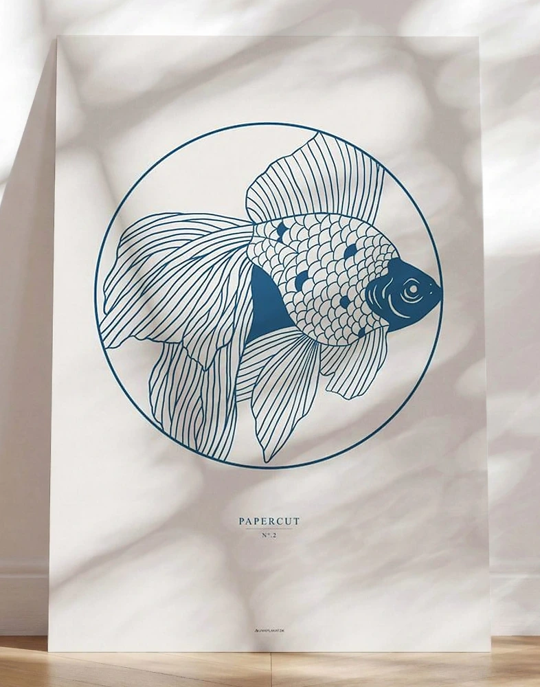 Pappersklistrad affisch med en liten fisk. Finns i rostbrun och blå version på en ljus sandfärgad bakgrund.