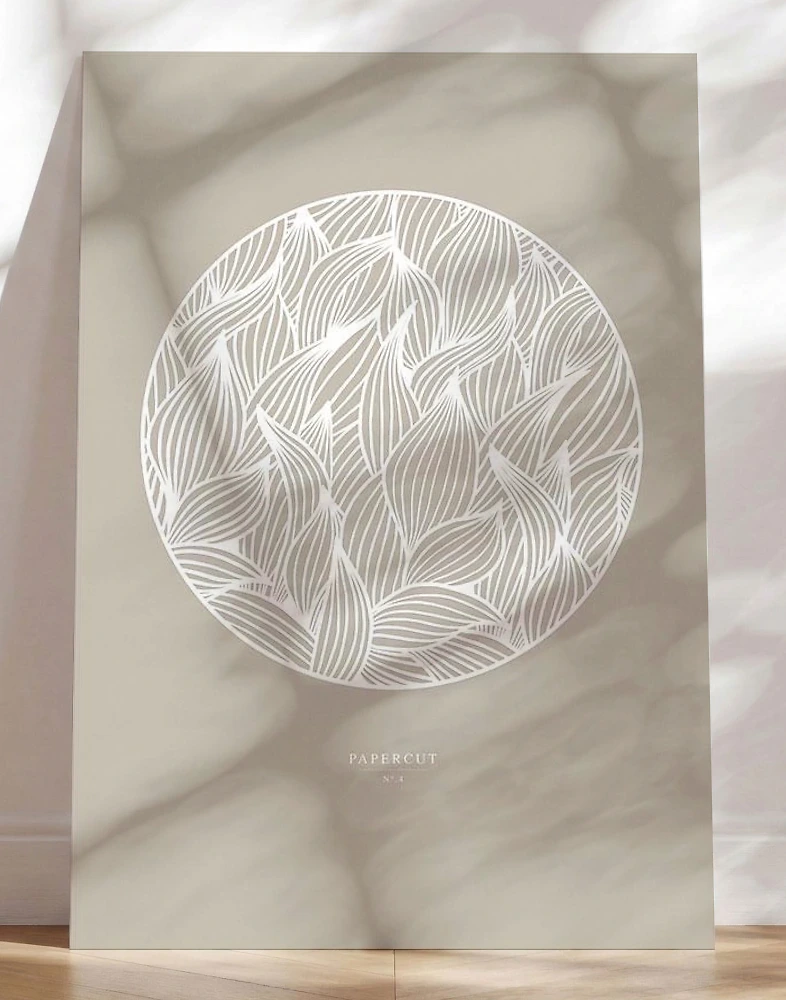 Djupblå pappersklipta affisch på en ljus sandfärgad bakgrund. Finns även i vitt på en något mörkare bakgrund.