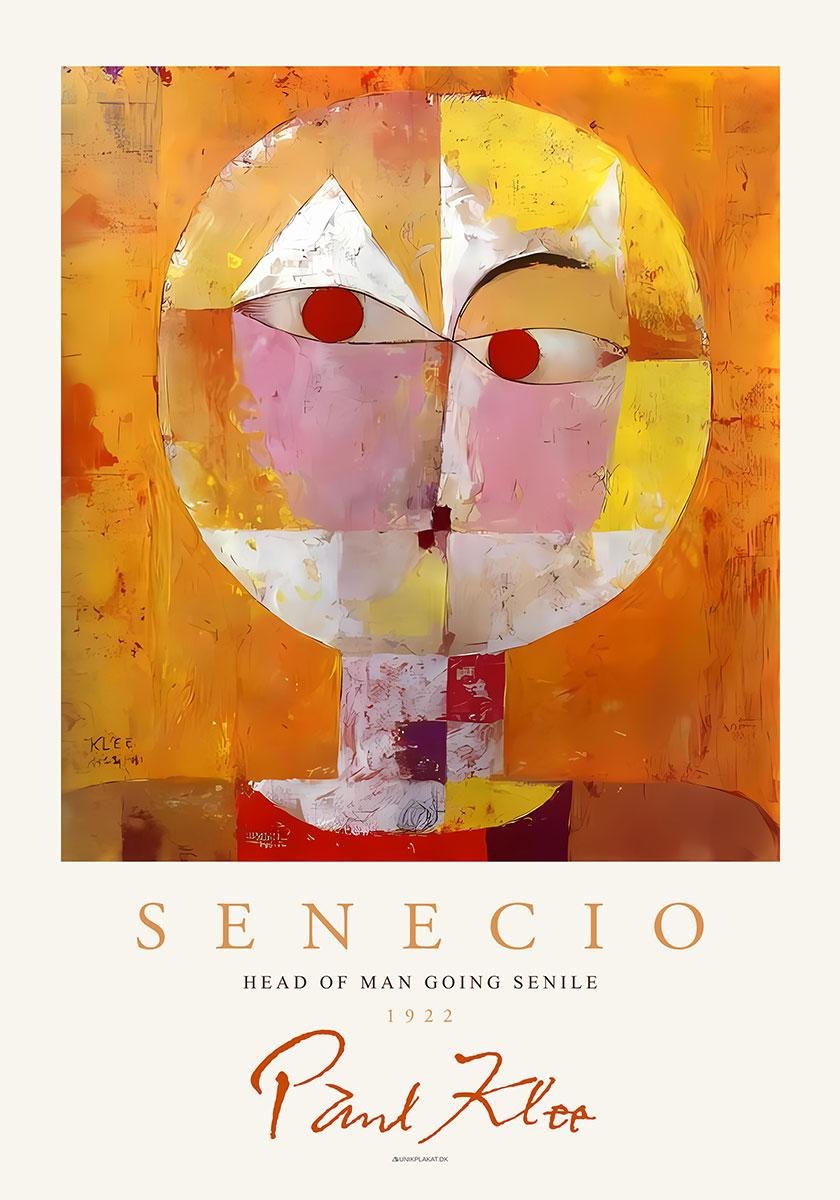Paul Klees Senecio från 1922 skapades under en period då han var knuten till Bauhausskolan. Verket är ett stiliserat porträtt av ett människohuvud, uppdelat i geometriska former och färger. Klee använde ljusa färger, enkla former och linjer, vilket resulterade i en abstrakt och nästan barnslig representation av ansiktet. Denna målning är ett exempel på Klees intresse för att kombinera figuration och abstraktion, samt hans nyfikenhet på att uttrycka känslor genom förenklade men distinkta former.