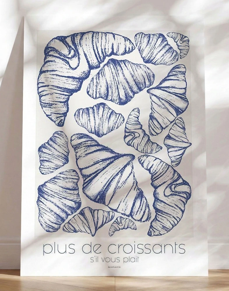 Affischer för köket är ofta affischer med matmotiv. Den här är fylld med mjuka, läckra halvmåneformade smördegsbakelser, även kända som croissanter. De doftar lite som ett trottoarkafé en söndagsmorgon i Paris, och de smakar mysigt. Så det är inte konstigt att du gillar dem. Lyckligtvis är de också ganska dekorativa.