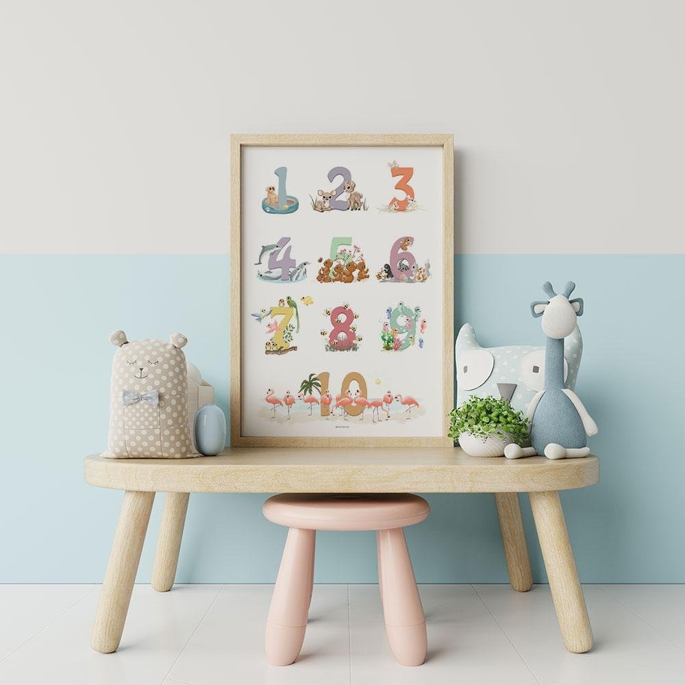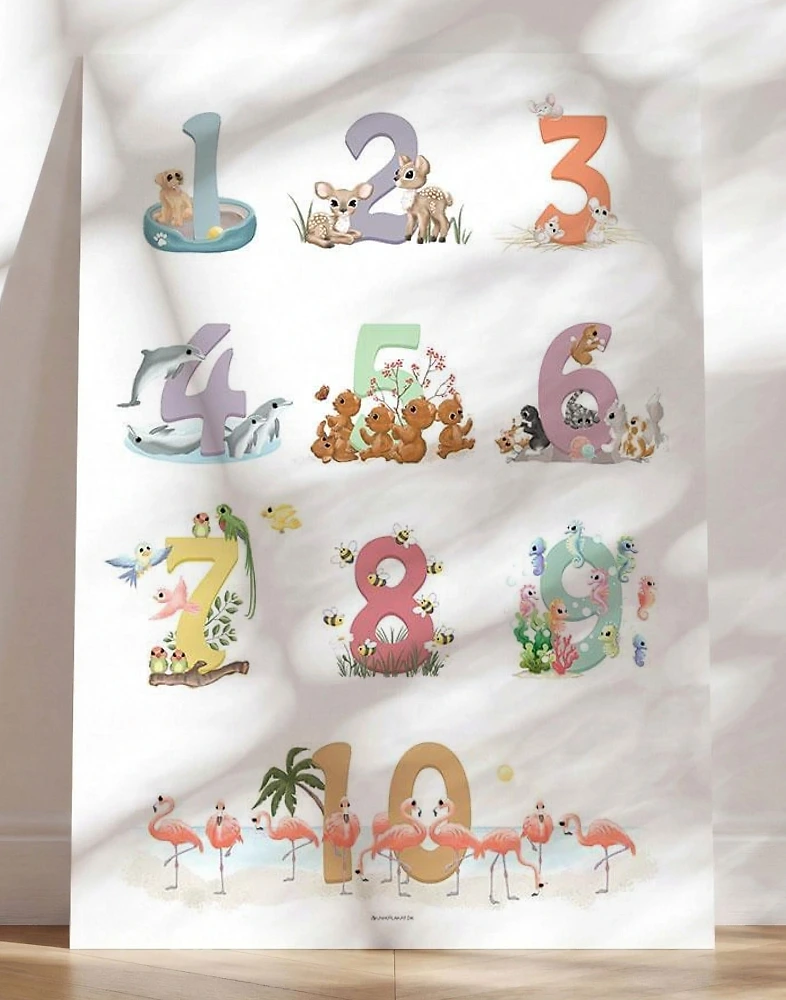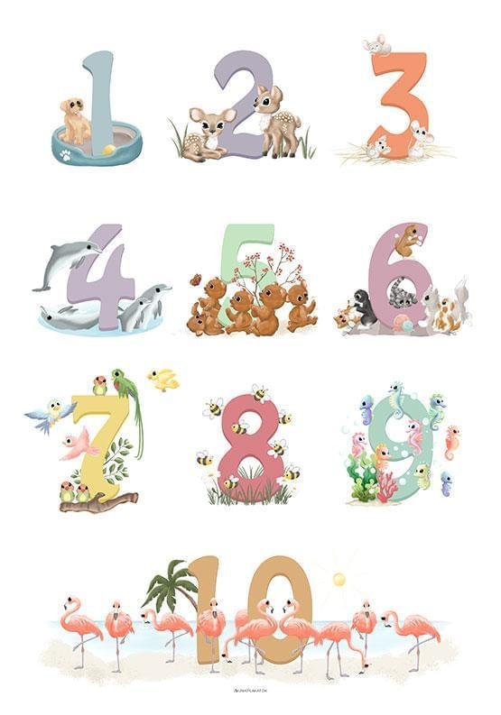 Sifferposter med siffrorna från 1 till 10. Varje siffra har sina egna djur, som är roliga att hitta och räkna.