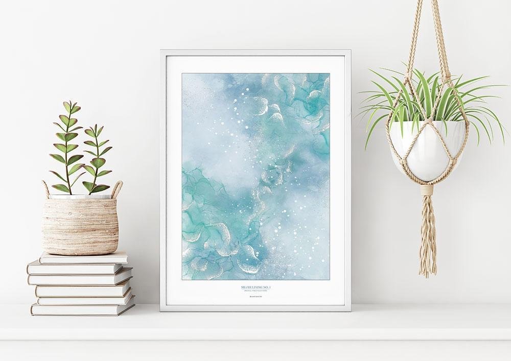 Här är ytterligare en av våra vackra posters med alkoholbläck – den här gången med detaljer i silverfärg. De fina metallstänken blandas med en stänk av flytande blågröna färger. Finns upp till 70x100 cm.