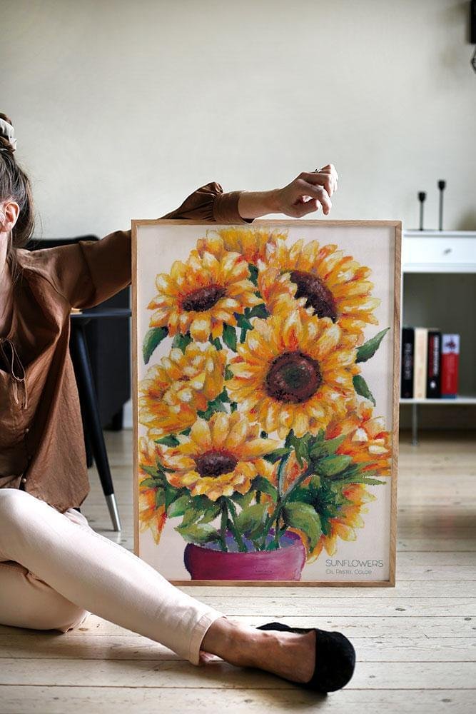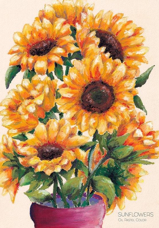Vackra gula solrosor ritade med krämiga, intensiva oljepasteller.