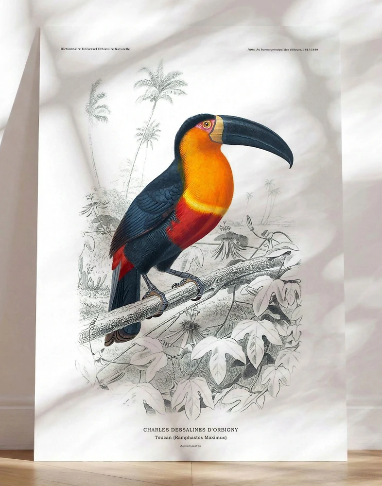 Tukanen, med sina livfulla färger, är en klassiker bland Charles Dessalines gamla illustrationer från uppslagsverket Dictionnaire Universel D'histoire Naturelle.