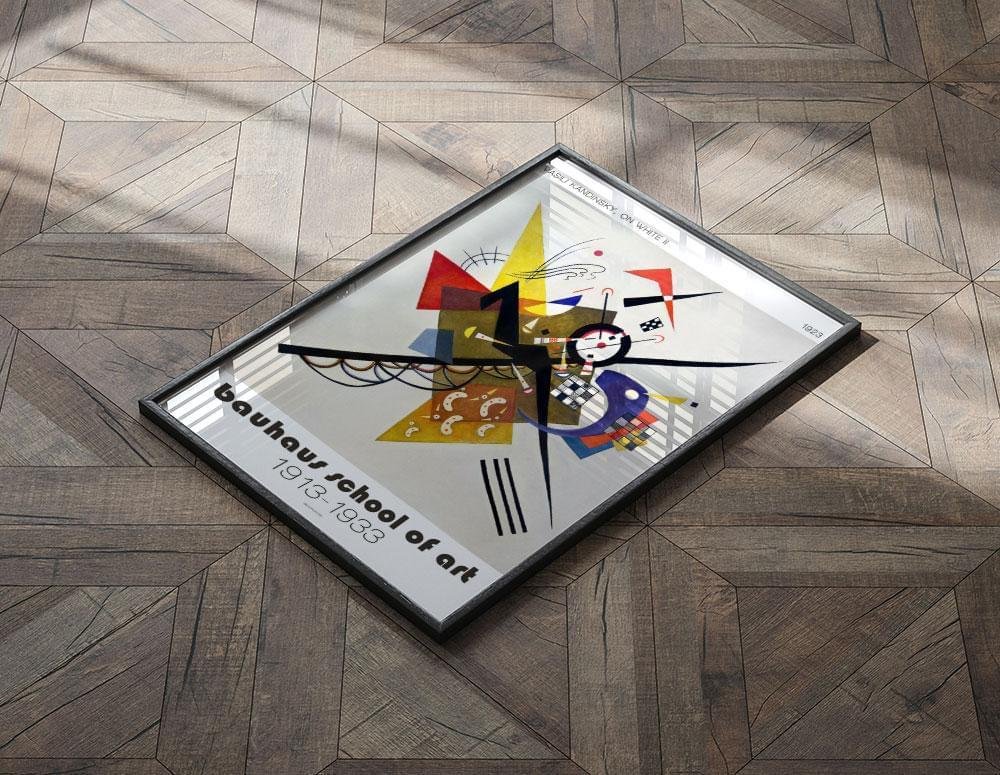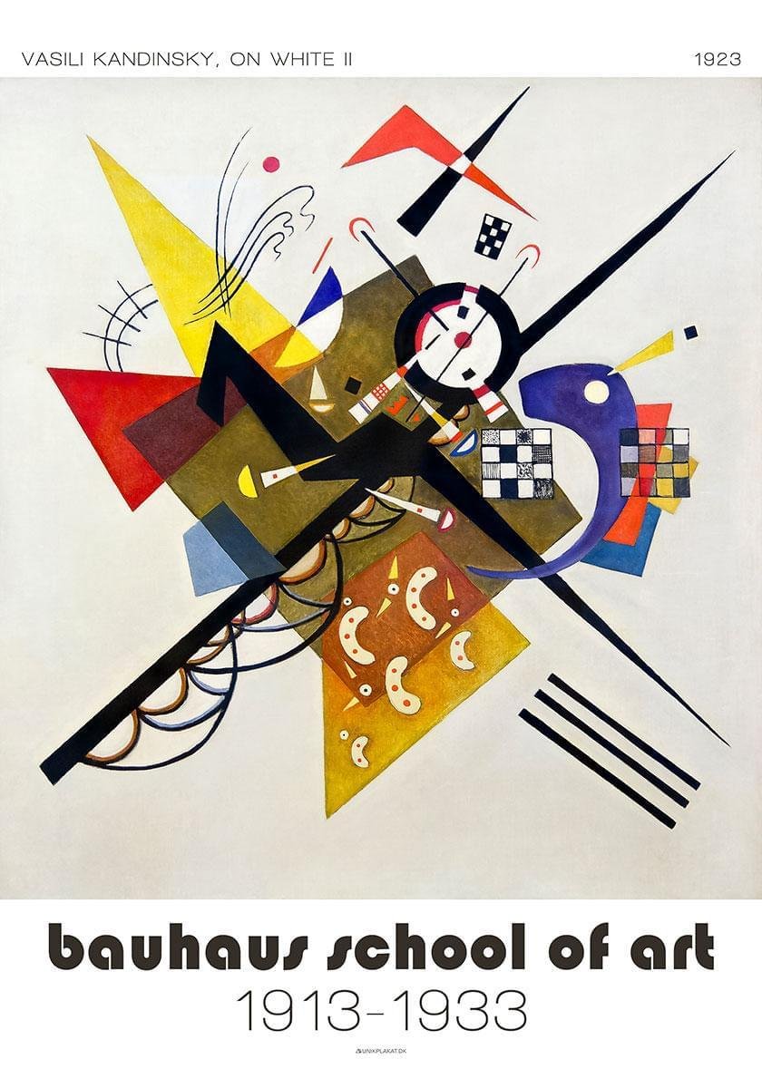 Vasily Kandinskys On White II är en livfull och abstrakt komposition från 1923. Målningen präglas av geometriska former och linjer som är så karakteristiska för Kandinskys stil. Det sägs att Kandinsky ville uttrycka oändliga möjligheter och andlig renhet med sina många former. Samspelet mellan rött, blått och gult fungerar perfekt. Med andra ord är On White II ännu ett av Kandinskys kreativa exempel på hur färger och former påverkar betraktarens känslor. Det finns både balans och energi i målningen, som härstammar från Bauhaus-perioden.